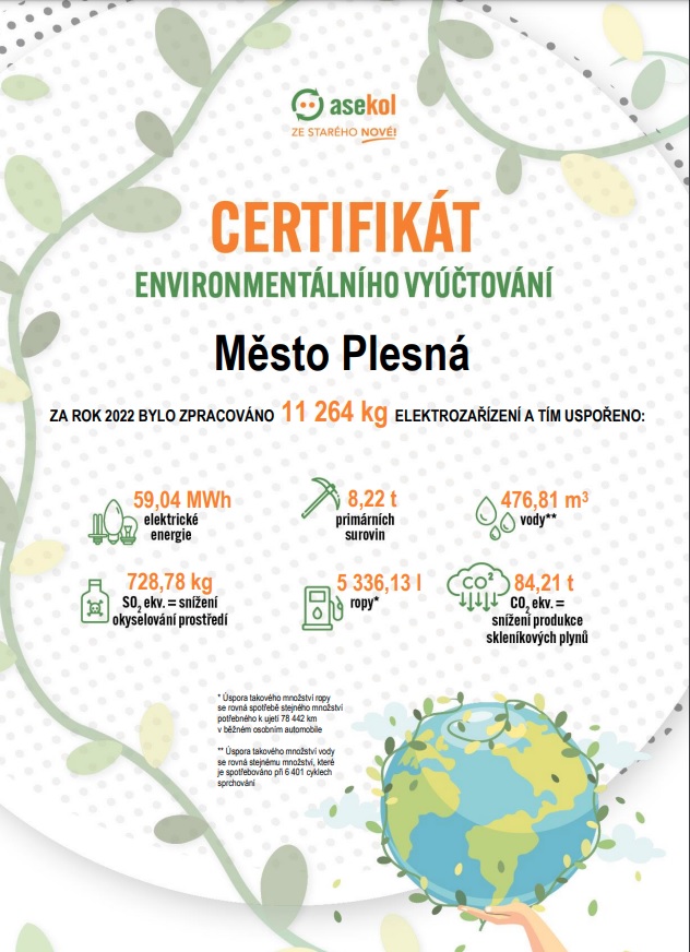 Certifikát environmentálního vyúčtování vyčísluje přínos naší obce k ochraně přírody v roce 2022. Vyplývá z něj, že díky množství námi odevzdaných elektrozařízení jsme uspořili 59,04 MWh elektřiny, 5 336,13 litrů ropy, 476,81 m3 vody a 8,22 tun primárních surovin. Navíc jsme snížili emise skleníkových plynů CO2 ekv. o 84,21 tun, a produkci SO2 ekv. (který zapříčiňuje okyselování prostředí) o 728,78 kg.